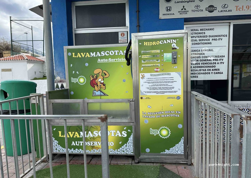 Laundry clean and tidy, 2 x large €7.5, 1 x medium €5.5, 2 x for dog bedding €5.5, 2 x large dryers €6 for 36min. multi language machine Spanish, English, German, French - payment with card, cash or membercard. Note that it takes a while after payment for machine to start. Parked 7m MH in front, but space is limited. Filled with LPG and rubbish/recyling bins close by.