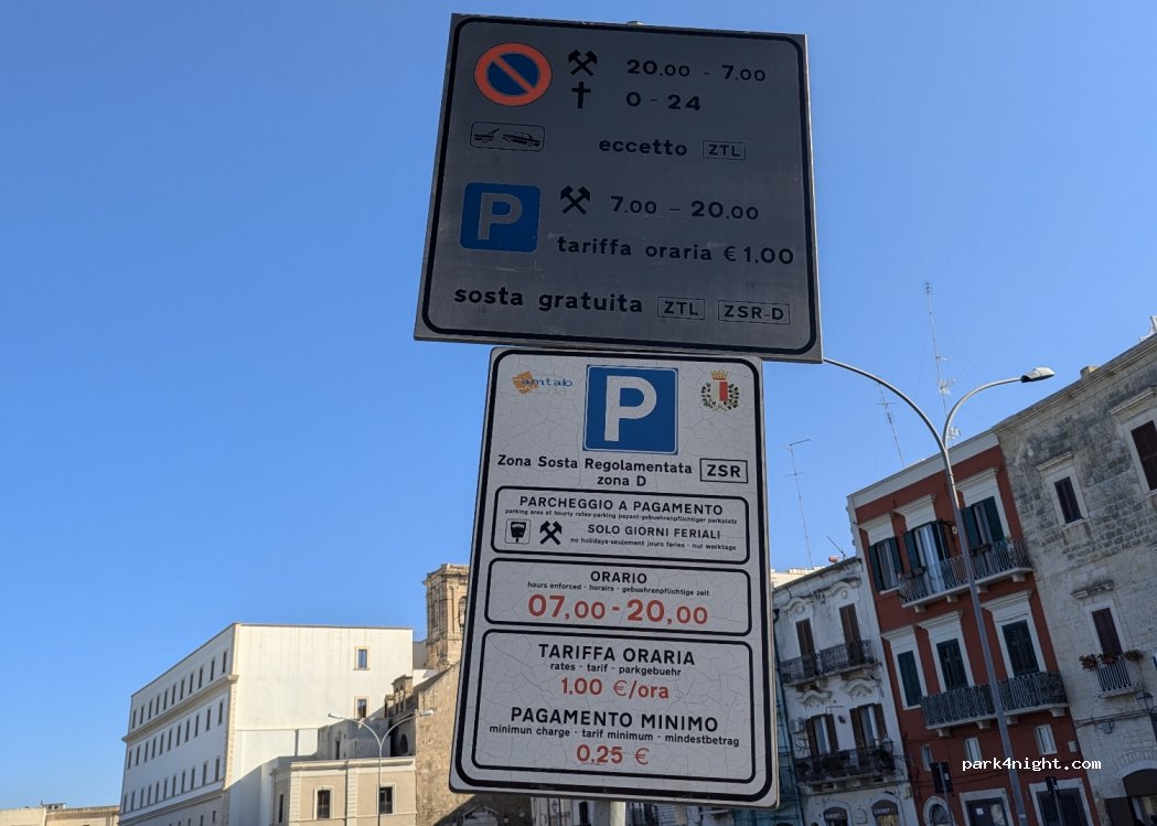 Its a totally fine parking lot with google walking distance to the old town of Bari. But: (1) no space for big cars/campers. T4 max. (2) only during the week at daytime, NO parking on weekends! Entire zone is a "no enter" zone at night/weekends. I uploaded a picture showing the exact times as of end of September 2024