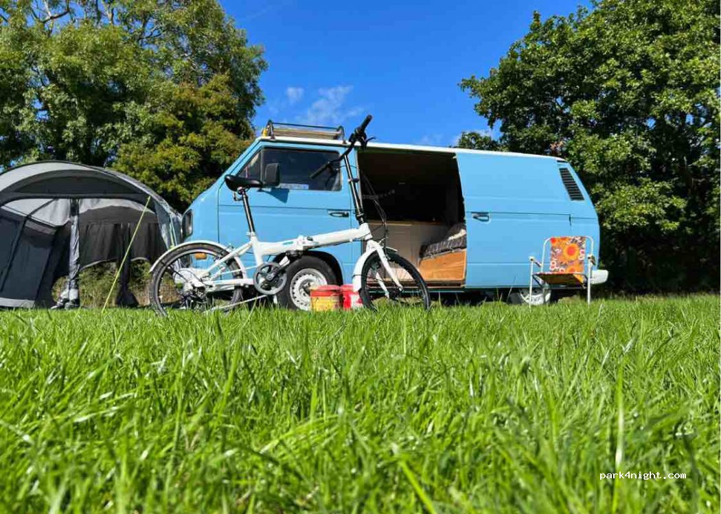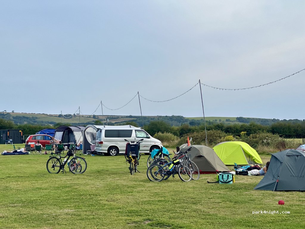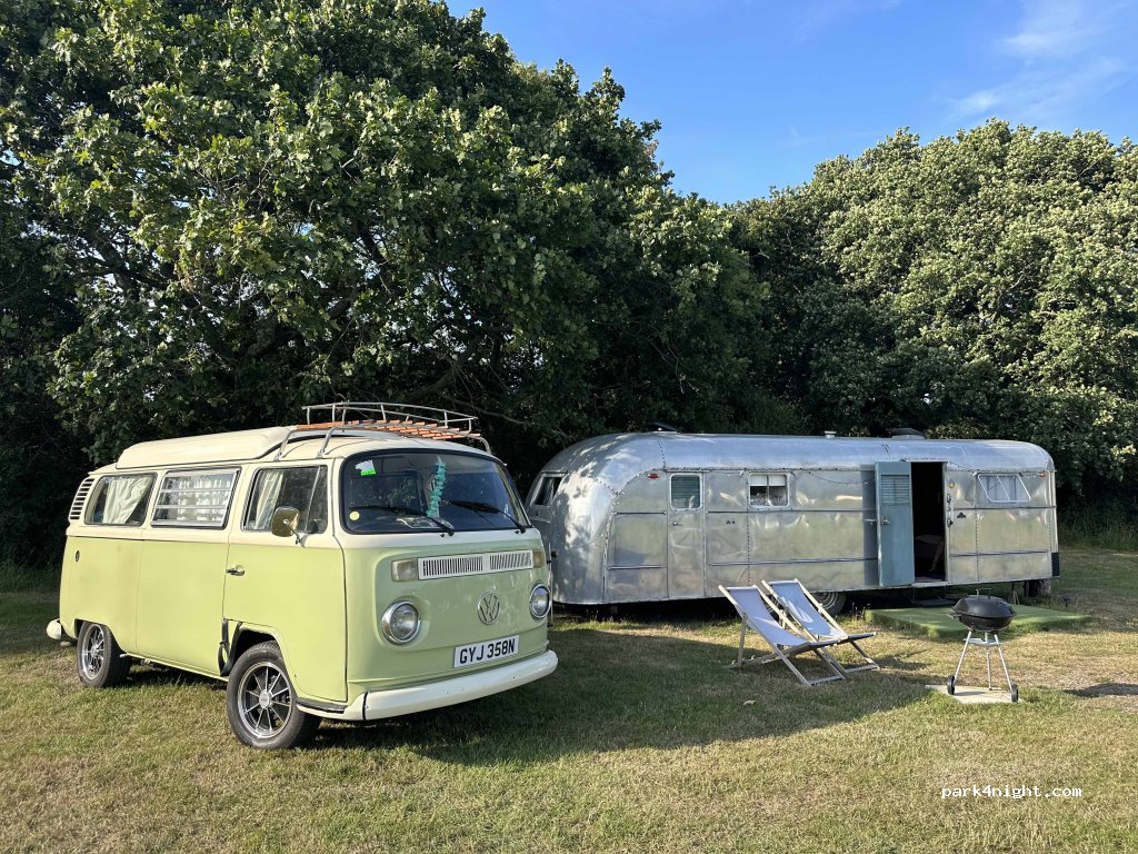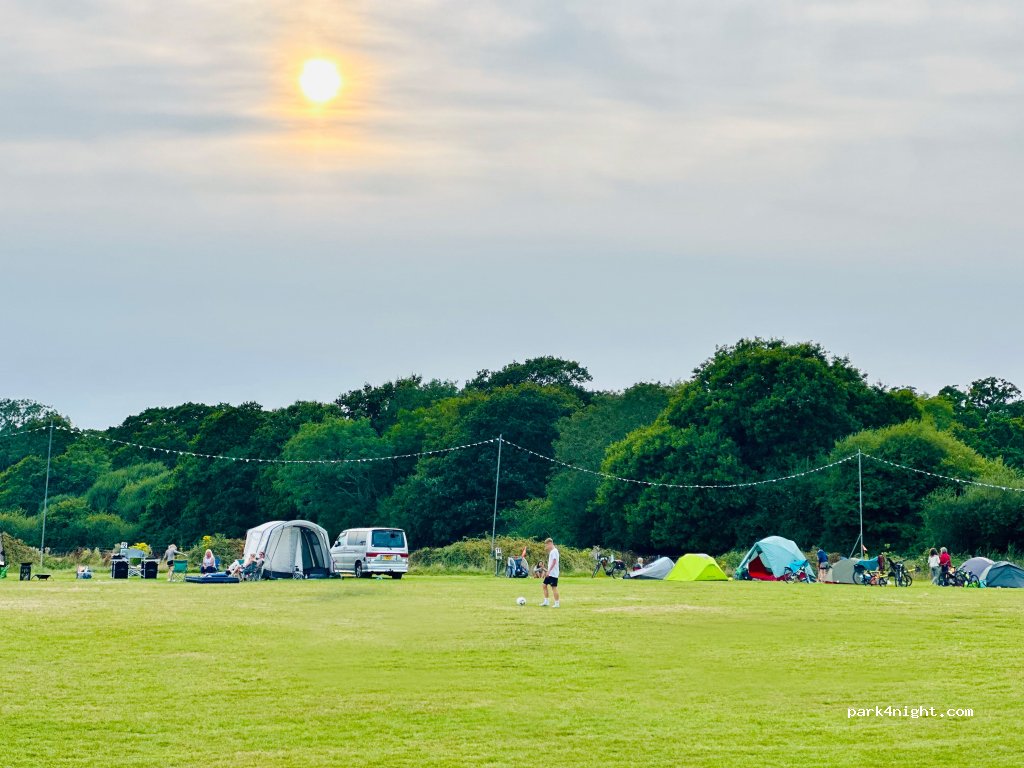 Lovely quiet site. We only booked 1 night but extended for the rest of holiday. Grass pitch £18 with EHU £25. Has Airstreams and pods to rent, all spaced around a field. Toilet block, and black water point. No road noise, in fact the loudest noise was a pheasant roosting nearby. The farm shop was an added bonus - open 24/7 - takes cards. Had all the basics everything we tried was great.