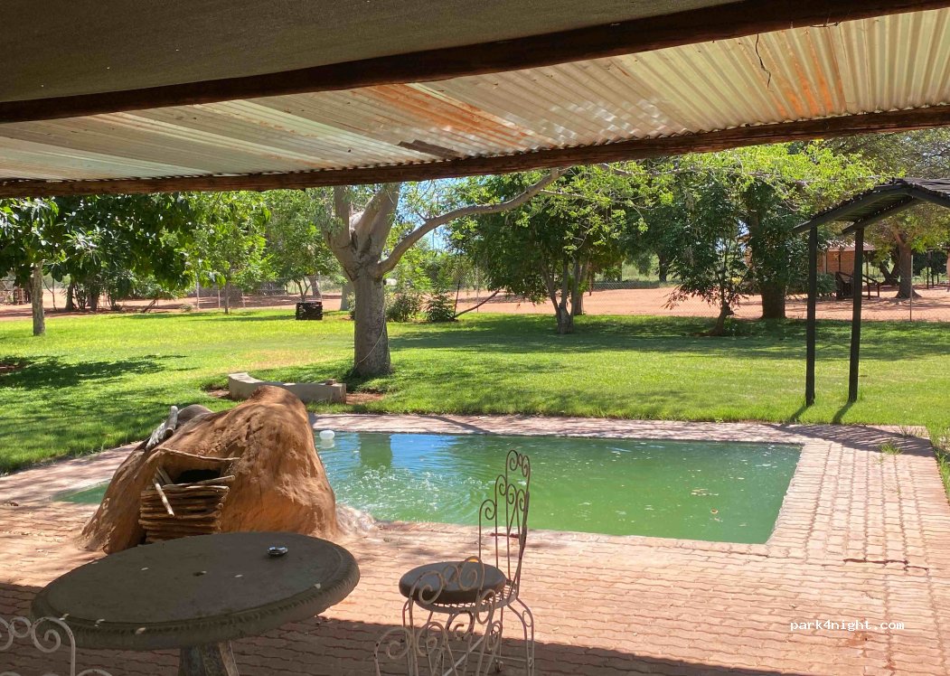 Camping op circa 40 km van de grens met Botswana. Circa 10 plekken op grond met veel schaduw van bomen. Bar en restaurant met goede wifi. Zwembad is ongelooflijk smerig: groen met veel vuil. Sanitair is uitstekend.