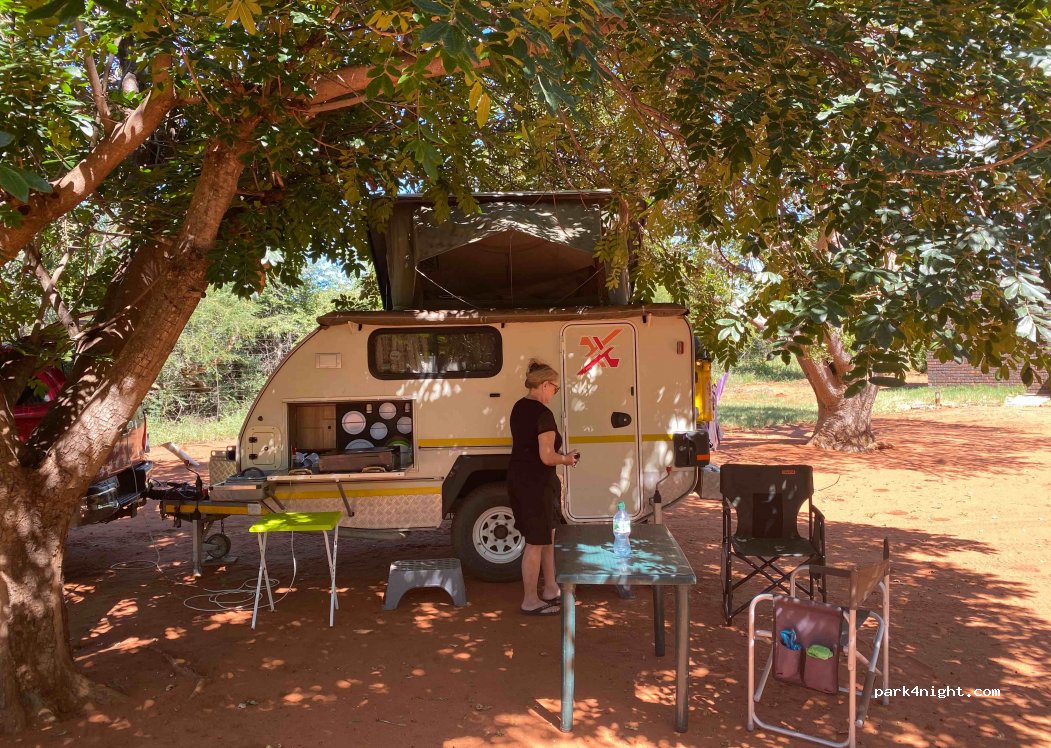 Campingplatz ca. 40 km von der Grenze zu Botswana entfernt. Etwa 10 Plätze auf dem Boden mit viel Schatten von Bäumen. Bar und Restaurant mit gutem WLAN. Der Pool ist unglaublich dreckig: grün mit viel Dreck. Hygiene ist ausgezeichnet.