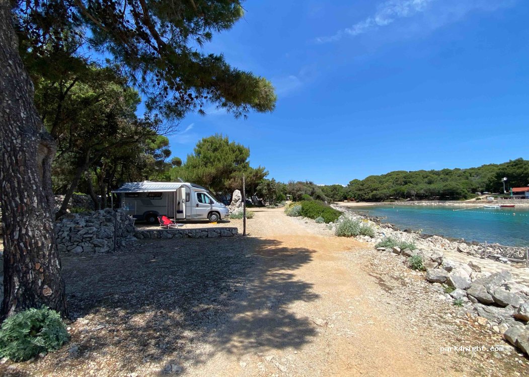 Etwas unübersichtlicher aber an und für sich schöner Platz mit richtig schönen Stellplätzen direkt am Meer. Diese sind jedoch meist belegt. Wollten eine Nacht bleiben, zwei Personen + 1 Kastenwagen würde 72€ kosten. Ein Platz hinten im Wald, Schatten, relativ dunkel, wäre 55 € gewesen. Wir sind weitergefahren weil einfach viel zu teuer. Stehen jetzt vorne in Osor um 27€ in der Sonne mit Meerblick.