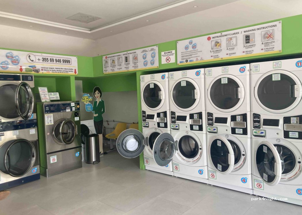 Buanderie avec quelques laveuses et sécheuses. Lavage 250 lek / sèche-linge 100 lek. Il y a un parking (payant) juste au coin de la rue, uniquement adapté aux véhicules courts. De plus, boulangerie et grand supermarché juste à côté.