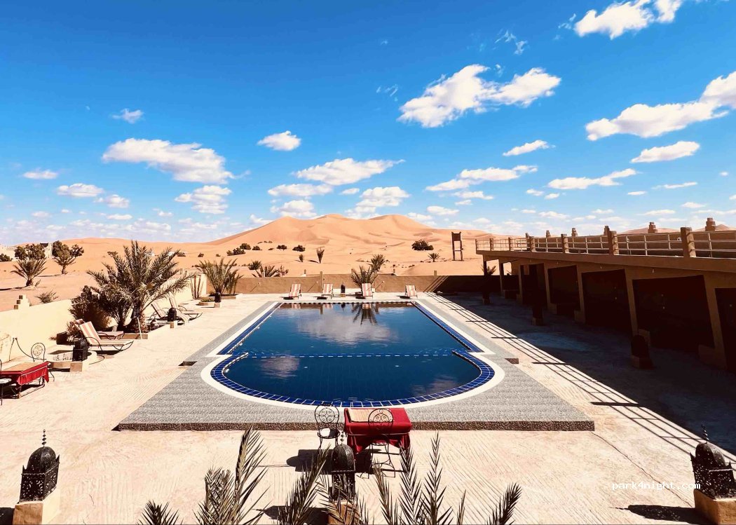 Nos han recibido muy bien con invitación a una taza de té, aparcas casi en la duna y mismo enfrente de la duna grande. Todo está muy limpio, tiene todos los servicios aparte de varias estancias comunes con una bonita decoración duchas agua caliente, una piscina excepcional, desde ahí un espectáculo de amanecer mientras desayunamos pasaron varios dromedarios a escasos metros.Nos ha gustado mucho