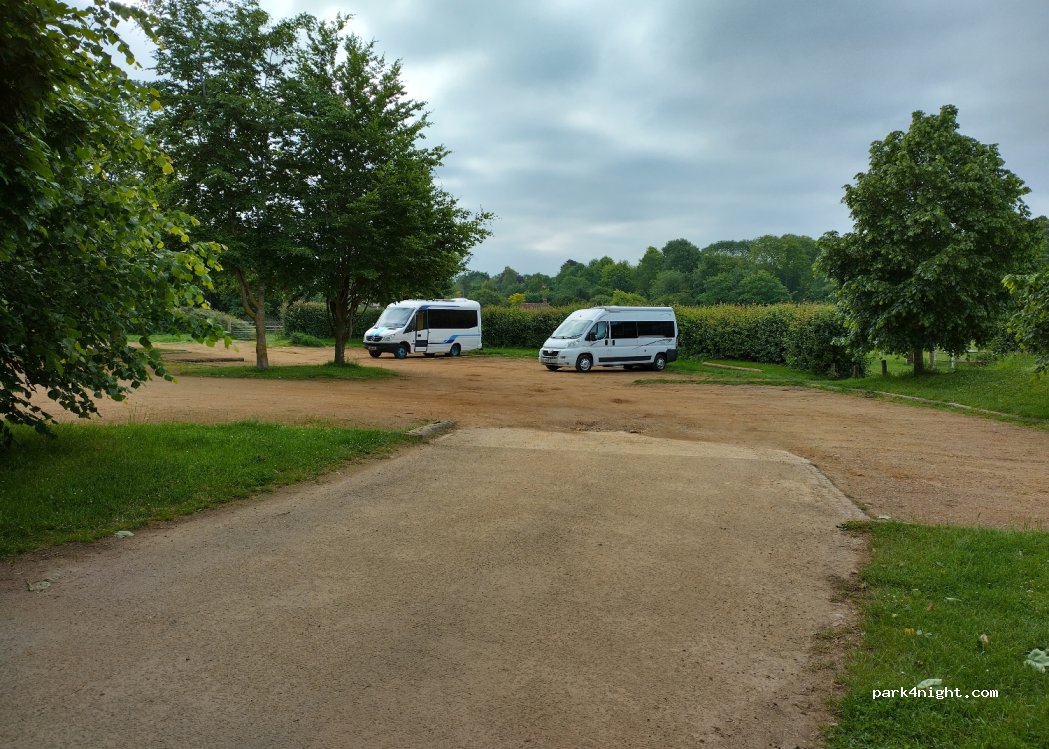 great quiet stopover next to park with walks & outdoor exercise equipment. slightly sloping in places. probably max 7 m vans.we visited Style Acre, social enterprise cafe in Savages garden centre 2 mins away across the road lovely breakfast! also have shop selling groceries.