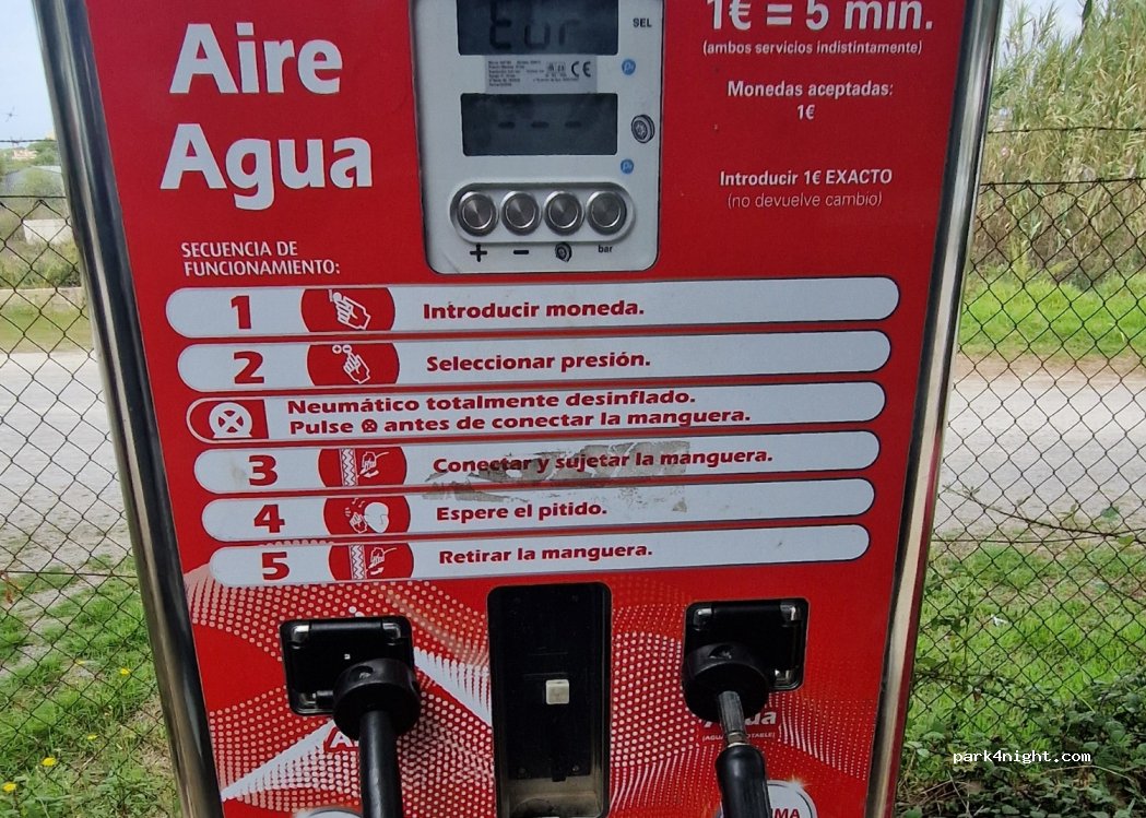 Serviço de agua para encher deposito Caravana 1 € por 5 minutos. Com 2 euros enchi deposito de 100 lt. e ainda sobrou tempo. Tem self-service de lavandaria lavar / secar. Tem bomba gasolina e loja de conveniência.