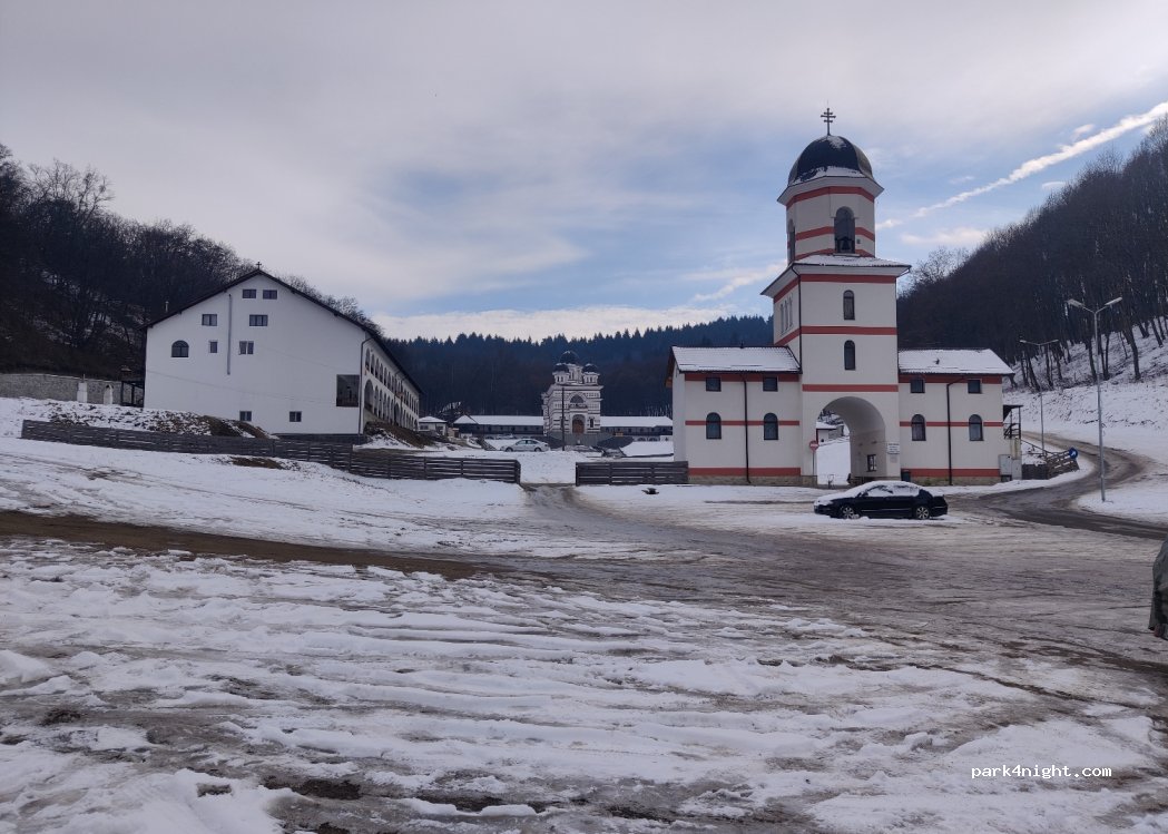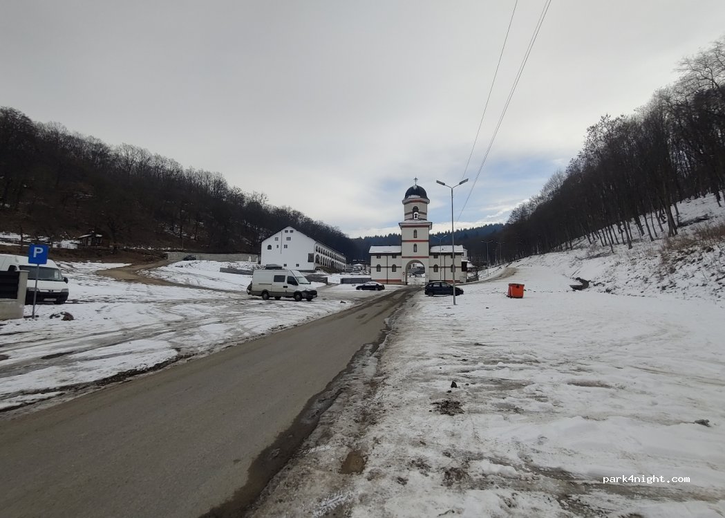 Quiet night in a small residential area in front of the monastery. large illuminated parking area on uneven ground. Suitable for one night.