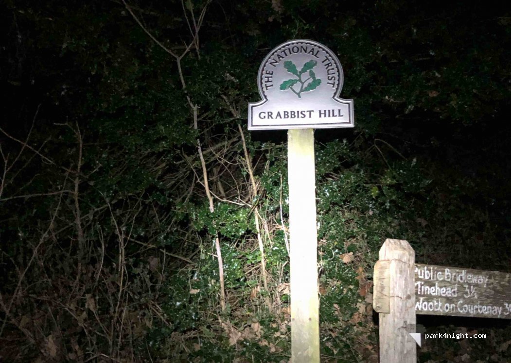 Large dirt parking area on side of a country lane for national trust Grabbist Hill walk. Reasonably flat. Only leave footprints please, no signage