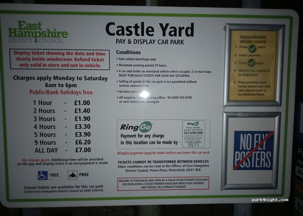 Car park free from 6pm till 8am and no mention of overnight parking. Close to pubs and shops.