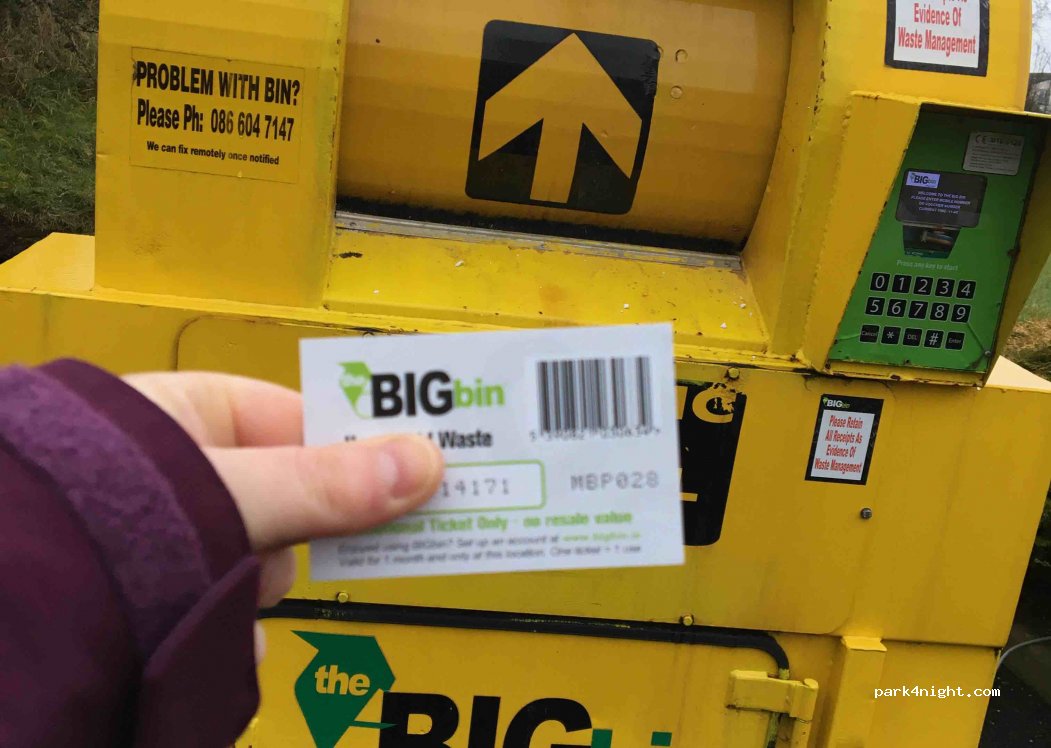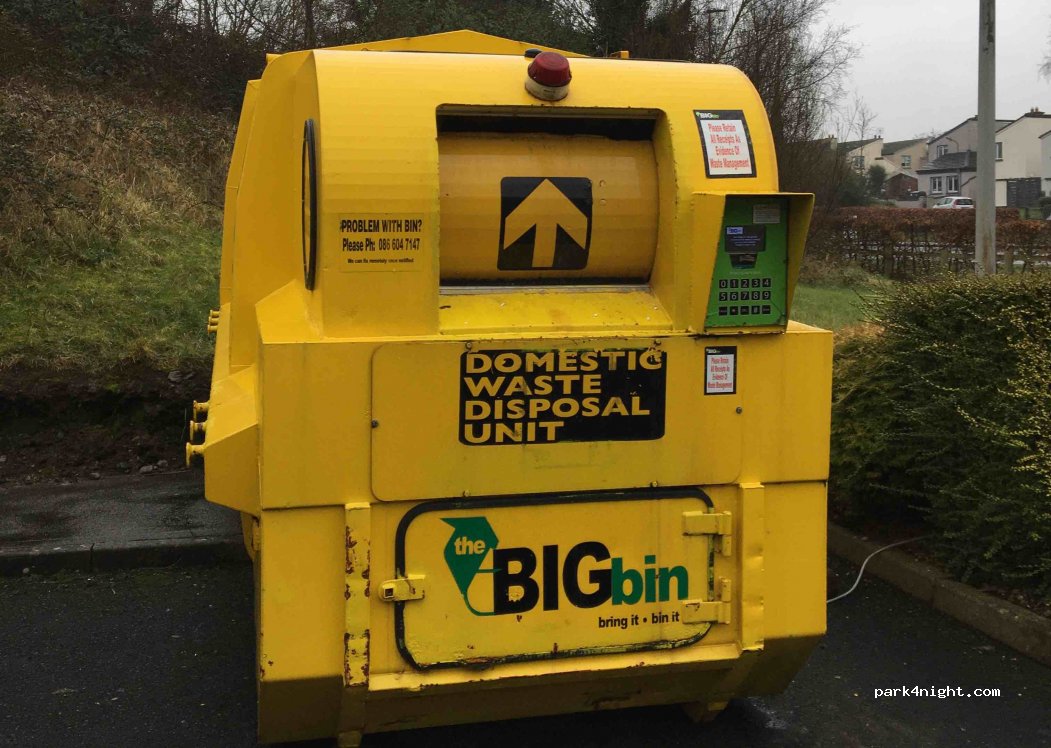 Big bin household waste disposal pay per use. Paid recycling also avalible. At the rear of the circle K petrol station. Pay inside for a ticket for the bin, then follow instruction on ticket. Bins are bright yellow at back of building. Petrol station also has a wash it yourself area that’s fits a van.