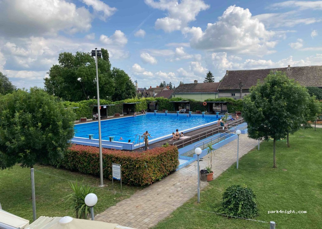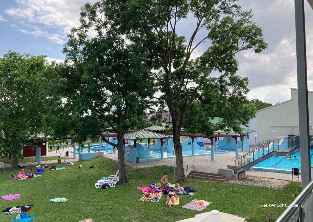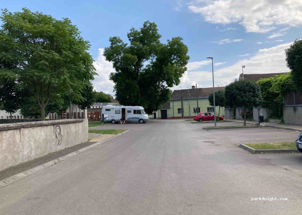 Grassy parking lot next to the swimming pool, on the bank of the Danube. The city center is 15-minute walk away. You can also stop here during the "Busójárás" festival if you arrive early. It's quiet at night. It is suitable for bigger motorhomes (7,5-8m).
