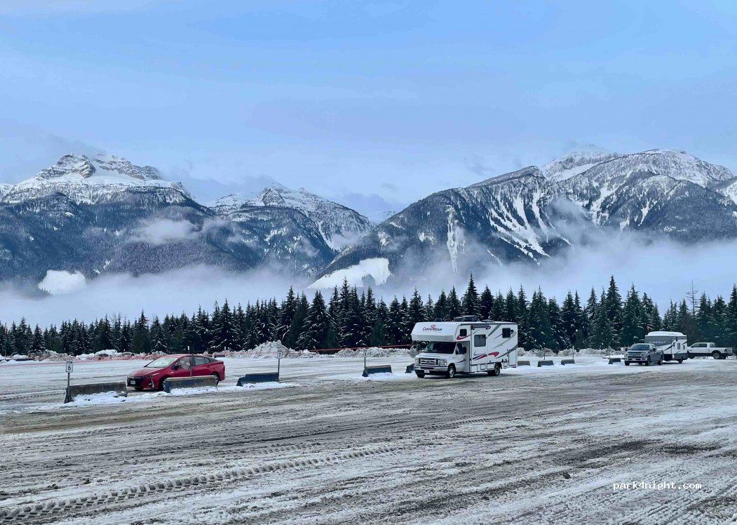Check in at the hotel and receive a parking pass. Large, safe, quiet, flat lot with tons of other campervans and RVs. Steps to the slopes for snowboarding!