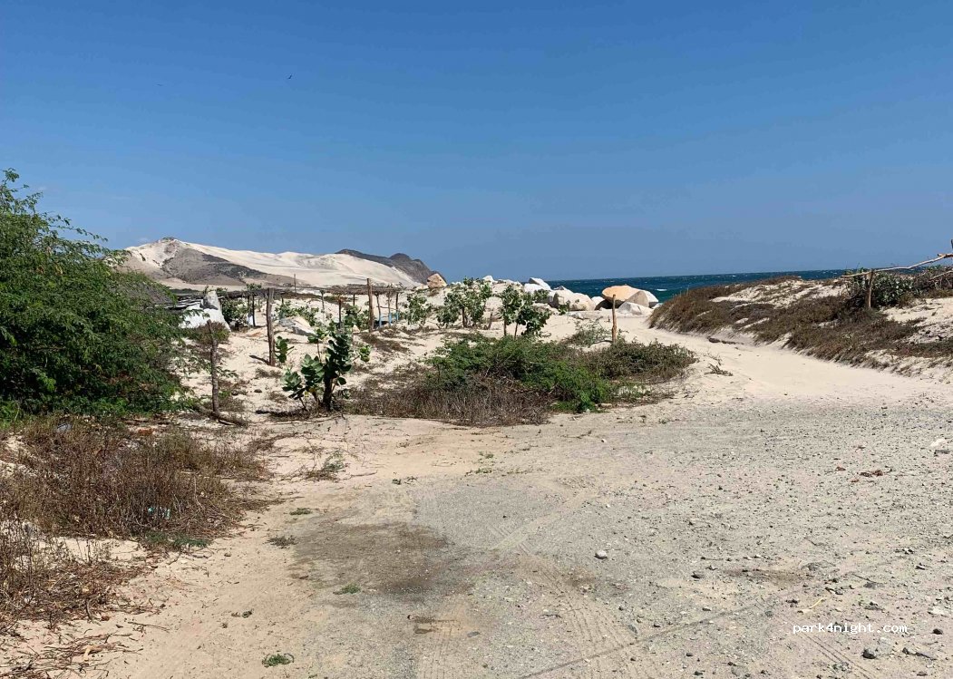 Aparcamiento para dos pequeños restaurantes junto al mar. Gratis si eres cliente de alguno de ellos. Lugar salvaje y espléndido. Ideal para surfear pero también es posible nadar. Magnífica duna para escalar si lo deseas. Fácil acceso para cualquier tipo de vehículo.