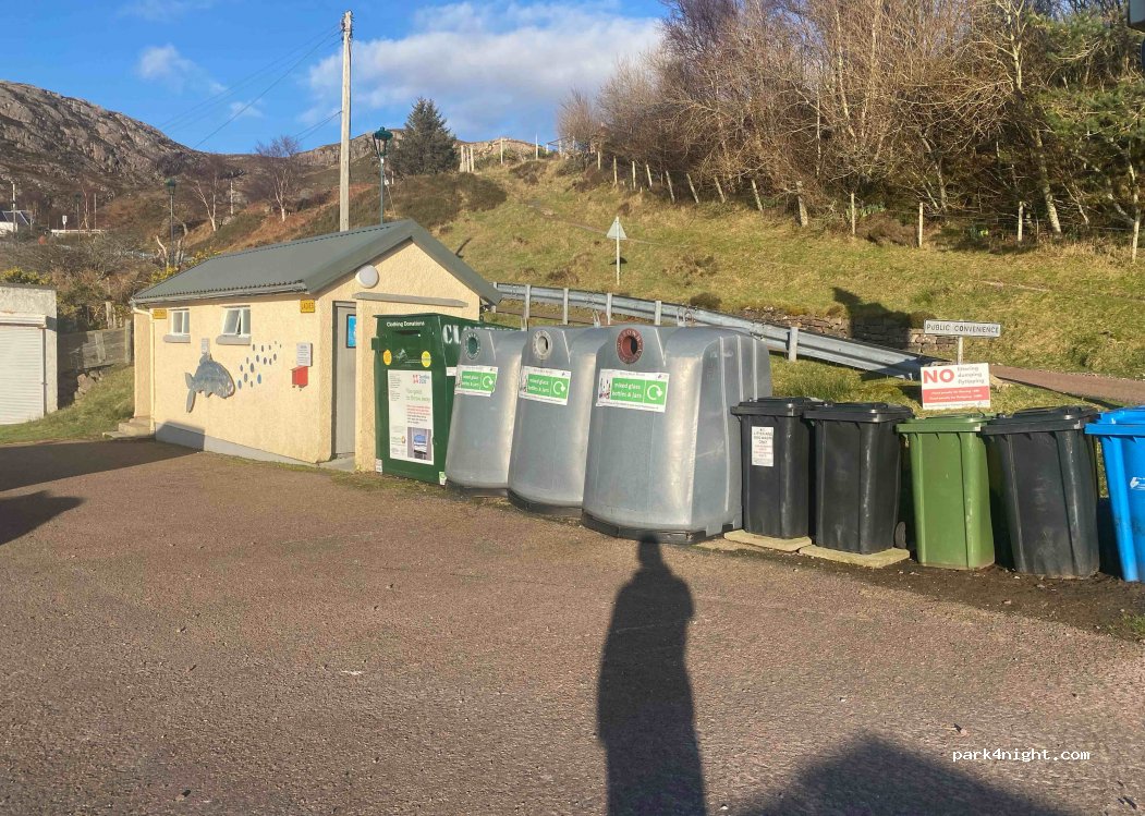 Parking for the public toilets. They ask for donations to help maintain the toilets which were spotless. NO LARGE MOTORHOMES OVER 6M. Recycling and bins here too. There’s also a lovely picnic bench with a nice view of the island which houses white tailed eagles in the spring!