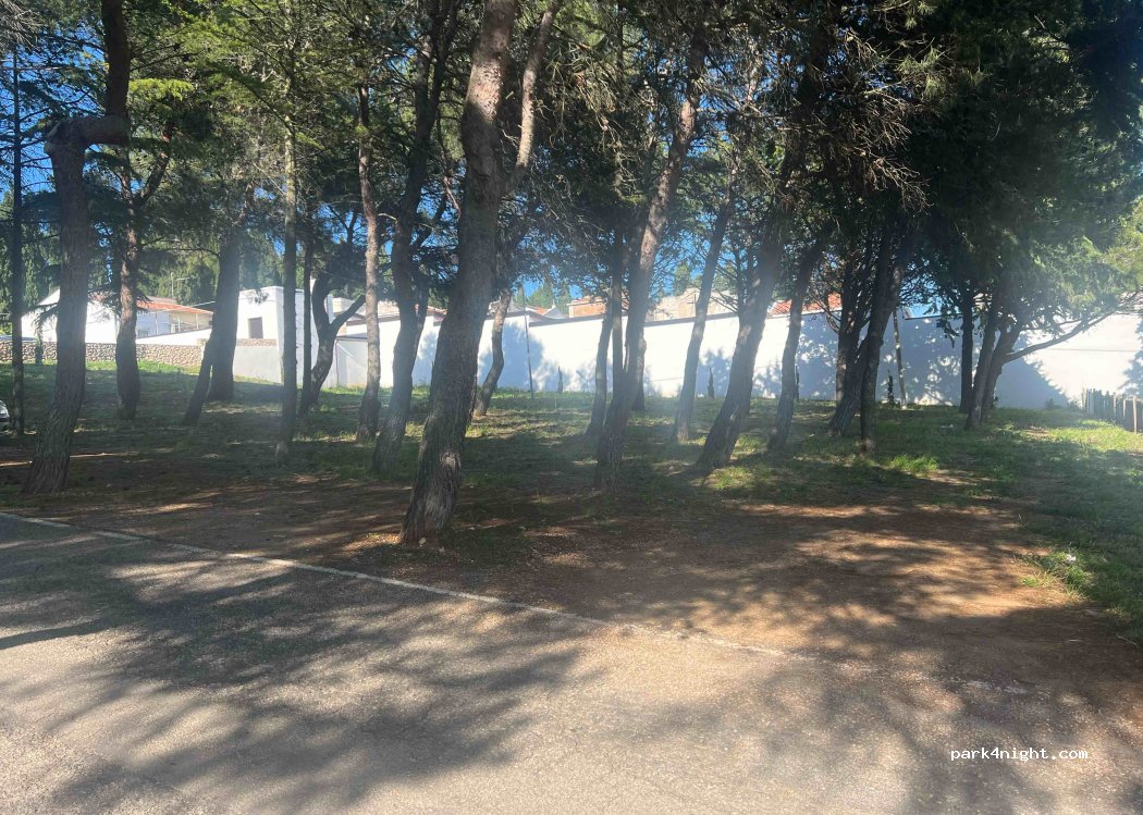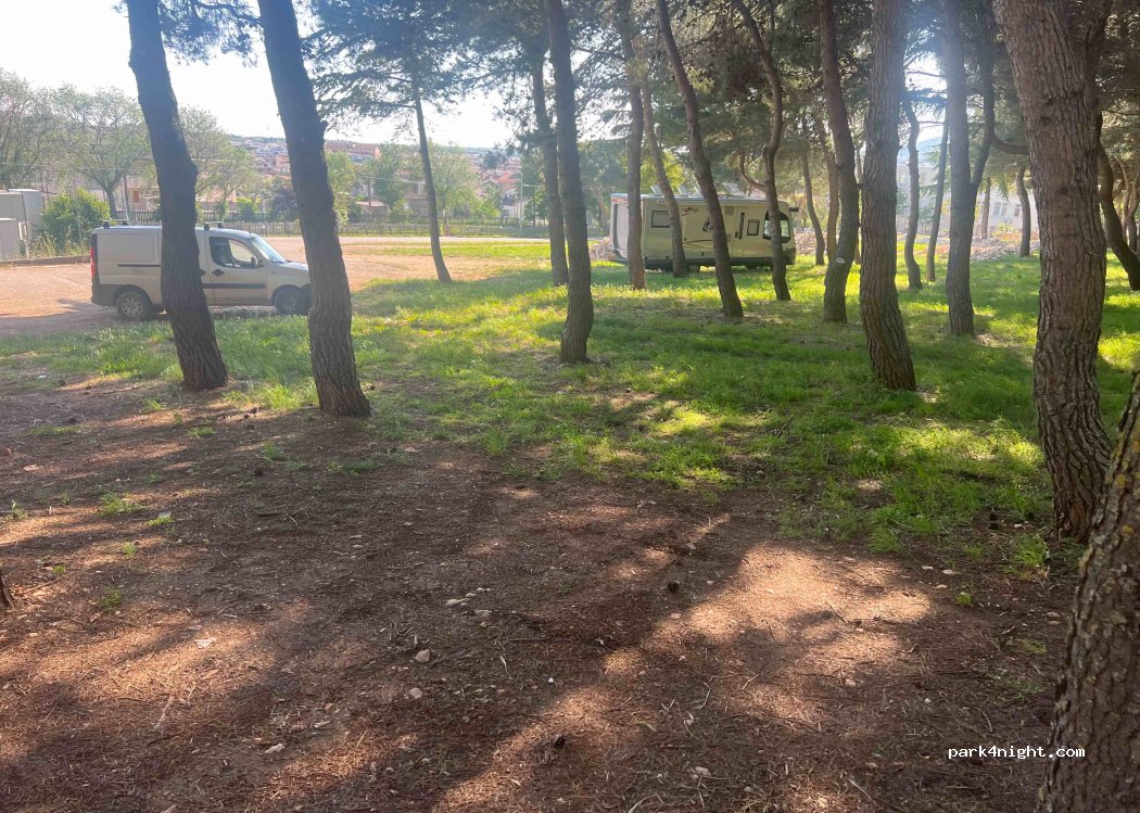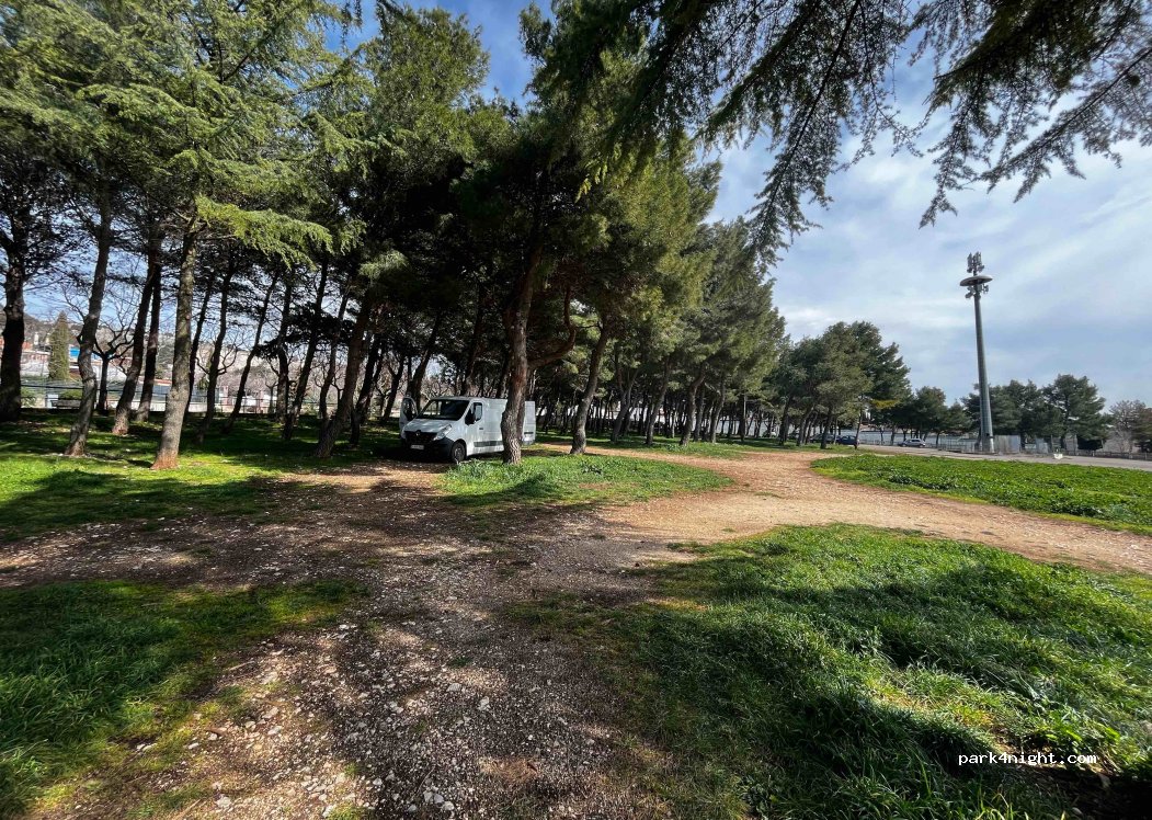 Parking in the center of the city with forest, this location is authorized because we were taken there by the police. They offered us a sandwich (probably to show their sympathy after scaring me with their gun and flashlight) they were very friendly and worried about our safety there