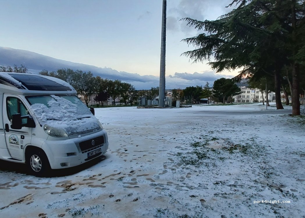Parcheggio nel centro della città con foresta, questa posizione è autorizzata perché siamo stati portati lì dalla polizia. Ci hanno offerto un panino (probabilmente per mostrare la loro simpatia dopo avermi spaventato con la pistola e la torcia) sono stati molto amichevoli e preoccupati per la nostra sicurezza lì