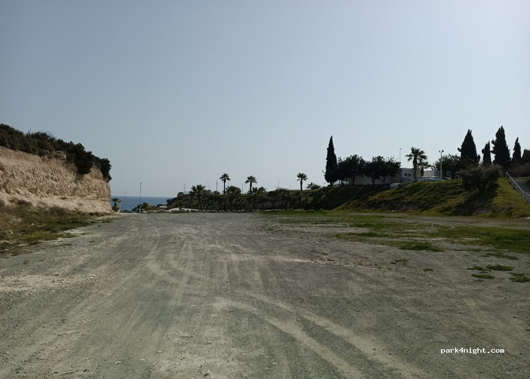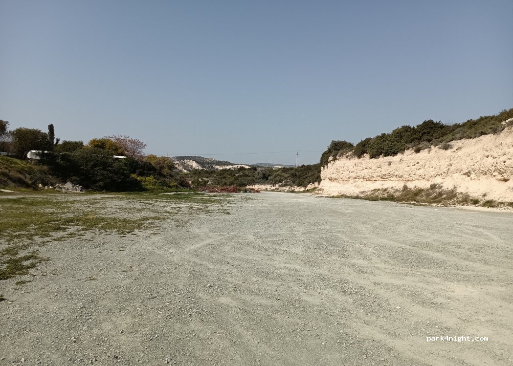 A large free gravel car park right next to the beach where there is a bar in the summer season, out of season the bar is closed and it is empty and quiet.