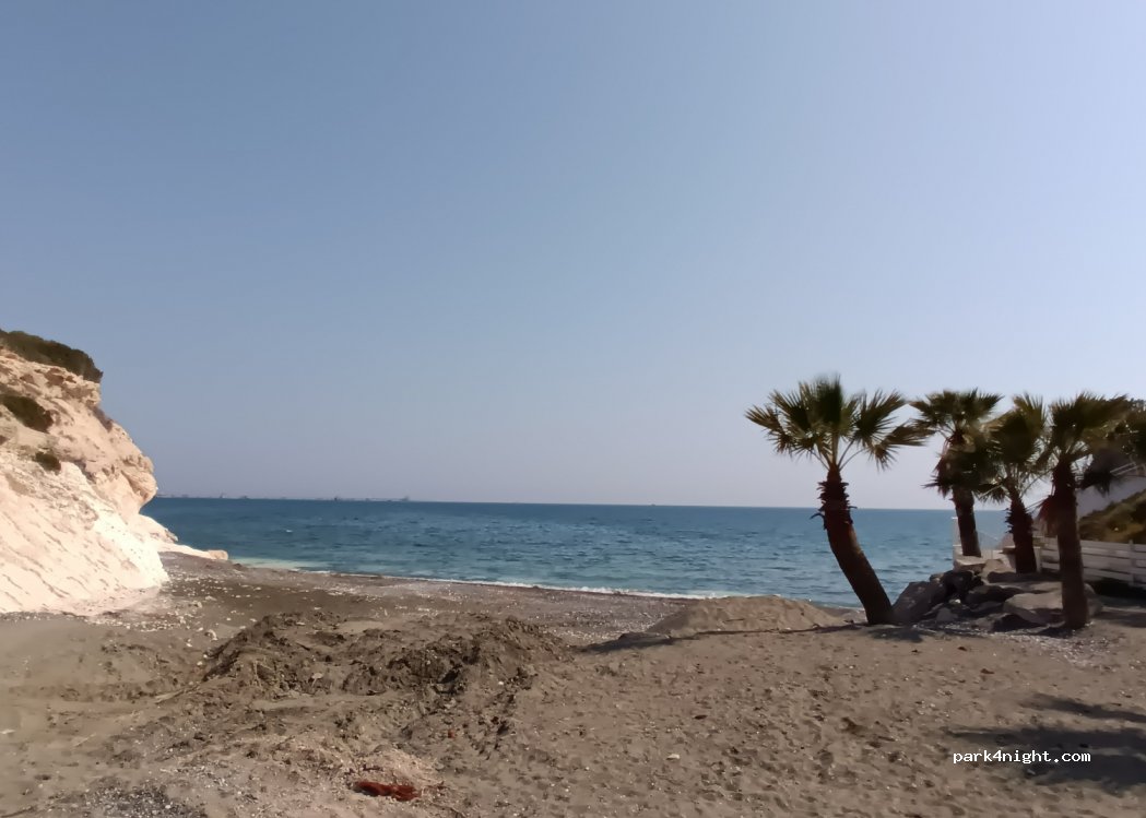 Ein großer kostenloser Kiesparkplatz direkt neben dem Strand, wo es in der Sommersaison eine Bar gibt, außerhalb der Saison ist die Bar geschlossen und es ist leer und ruhig.