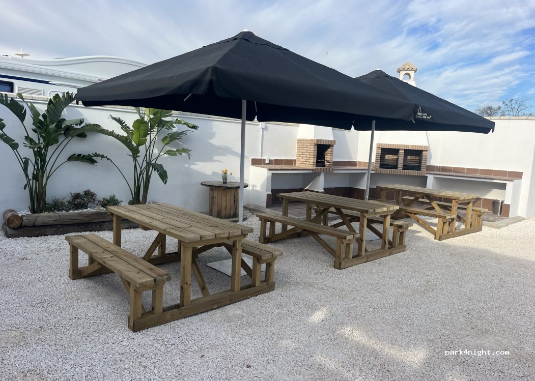 Área para pernocta de autocaravanas, caravanas y camper, con servicios de electricidad, wifi, fregaderos, baños, zona de barbacoas, lavandería,duchas, agua y desagües. Alquiler de coche y moto. Parcela videovigilada. A 20min andando del centro histórico, 10min en bici. Playa fontanilla a 15min andando. Máximo vehículos de 10 metros. No se admiten turismos. servicio solo de cambio de aguas 5€!