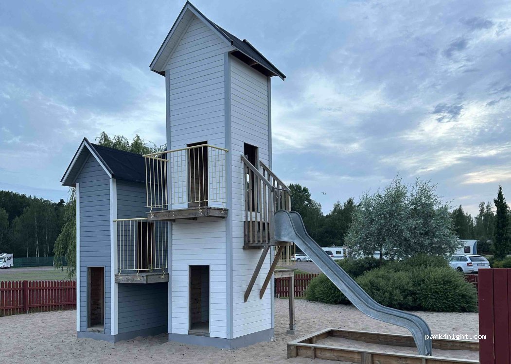Parkeerplaats in grind direct naast de parkeerplaats van Astrid Lindgrens World. Het veld werd volledig herbouwd voor het seizoen 2022. Nu zijn er 367 staanplaatsen (vooraf gereserveerd). In- en uitchecken via internet (ondersteuning alleen tijdens parkopeningstijden van 10.00 tot 18.00 uur). Inchecken tot 22.00 uur en uitchecken tot 10.00 uur. De instructies zijn als poster bijgevoegd. Er is een nieuw toiletgebouw met keuken, wasmachine/droger en afwasgelegenheid. Twee speeltuinen en twee afvoerstations voor grijs- en afvalwater en voor het bijvullen van vers water. Aan de overkant van de straat zijn nog eens 100 parkeerplaatsen (niet vooraf gereserveerd en alleen voor parkeren van 08:00 - 22:00 uur). Facturering vindt plaats op het moment van boeking met een creditcard. Een supermarkt ligt op ongeveer 400 meter afstand, een tankstation op ongeveer 700 meter afstand.