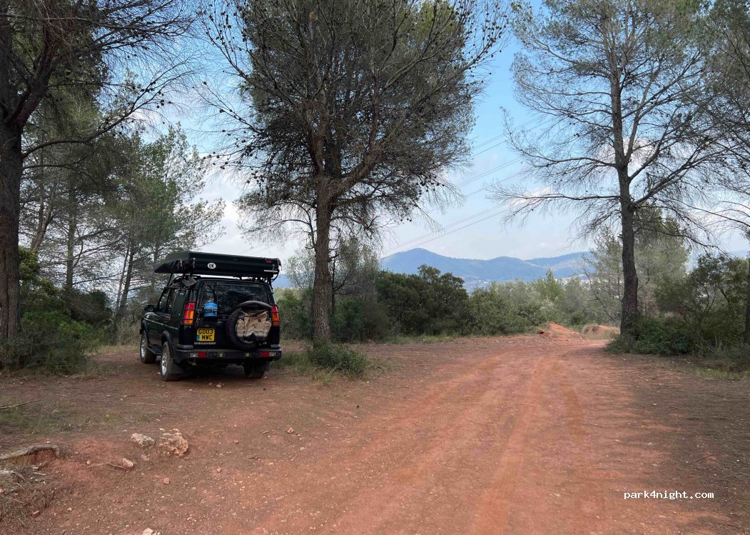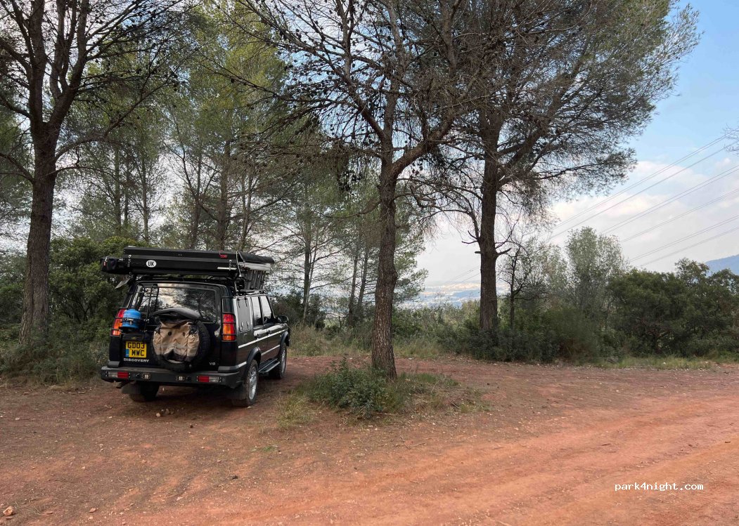 Beautiful escape underneath the trees near the top of the hill. Cut out next to the lane is reasonably flat. You could comfortably fit a few 4x4 vehicles here. Wonderful views!!