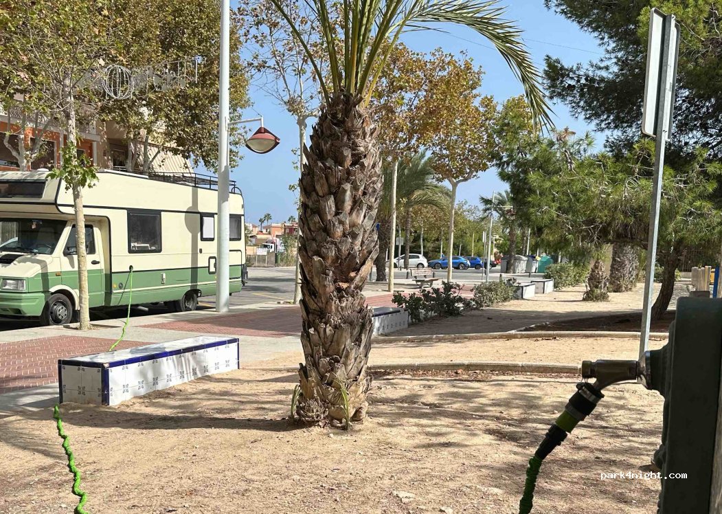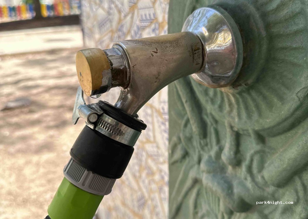 Prima plek. Als je een lange slang hebt en anders flessen vullen. Verder wel flexibele adapter nodig (zie foto). Parkeren bij de bushalte geen probleem. Er zit ook nog een playground voor kids naast. Water smaakt zeker niet naar chloor, eerder beetje zeepig maar lijkt prima voor campergebruik