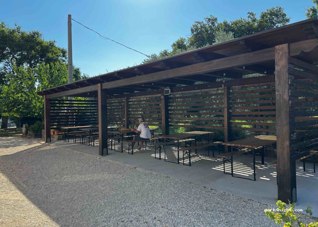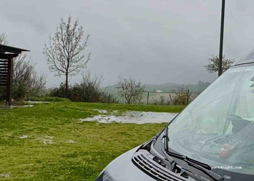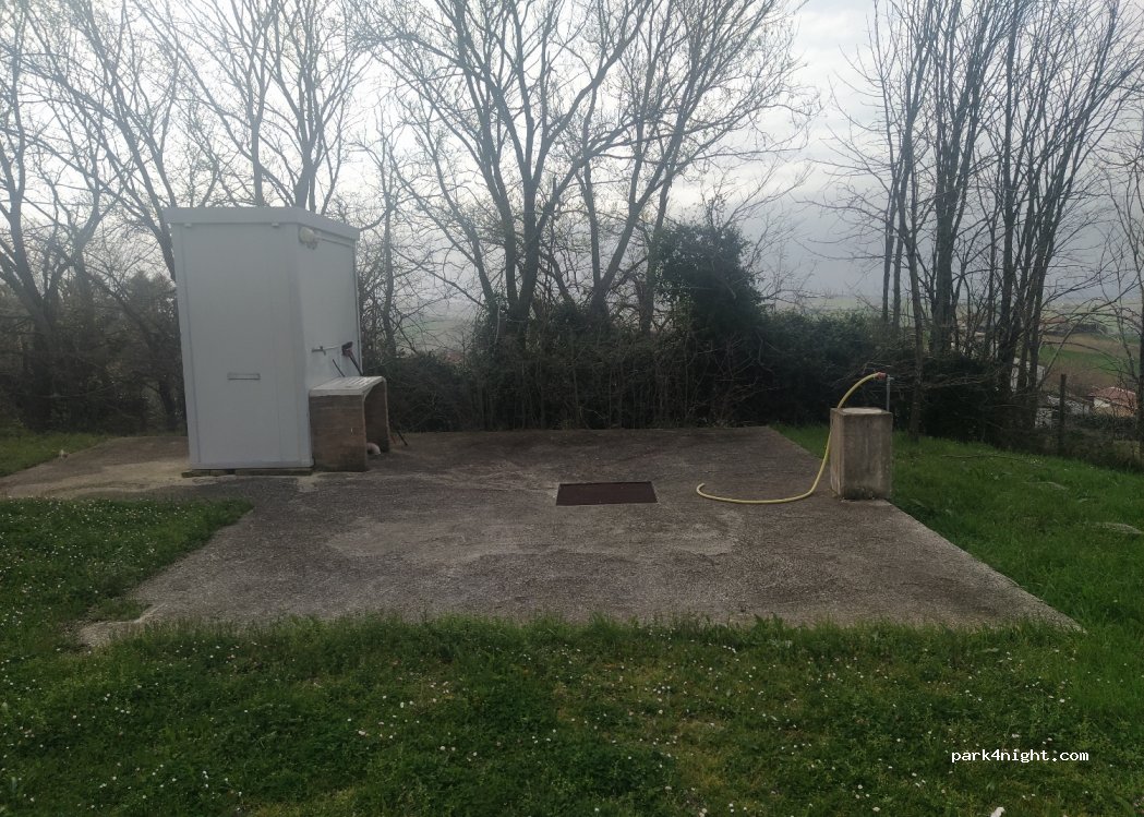 Rest area in a large meadow, away from traffic but easily accessible for all camper sizes. There is a very large canopy with tables and benches on an asphalted ground, many barbecues and light for the night. There is a bathroom with shower and sink, loading and unloading of grey and black water, an outside sink, column for electricity and bin for undifferentiated waste. View of the hills, immersed in tranquility. The farmhouse is located next door and the owners were very kind, possibility also to buy fresh eggs, meat and to eat at the farmhouse with local products. All this at the modest price of € 15, nowadays it is difficult to find these services at this price in such naturalistic places. Highly recommended for all campers, for camping with a tent evaluate the weather carefully: if it rains puddles can form being in a meadow.