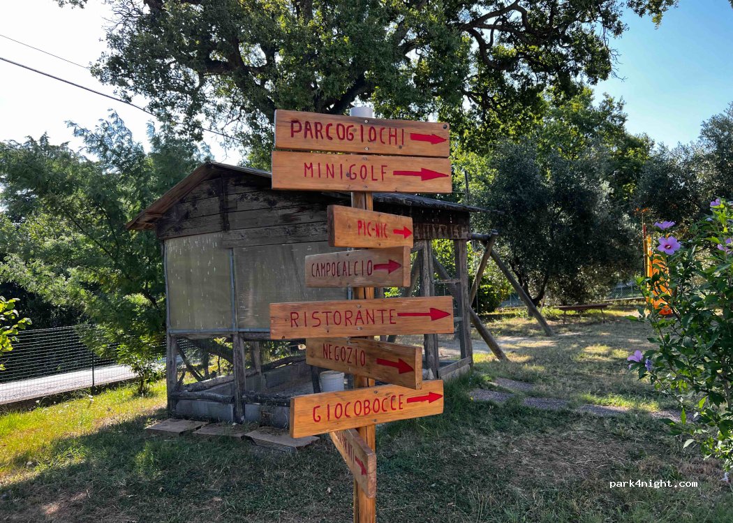 piazzole in erba, elettricitá, carico/scarico acqua, bagno con docce, area pic nic con tavoli panche e barbecue, gestita da una fattoria/ristorante e negozio con alimenti di loro produzione, 20 minuti a piedi dal paese.