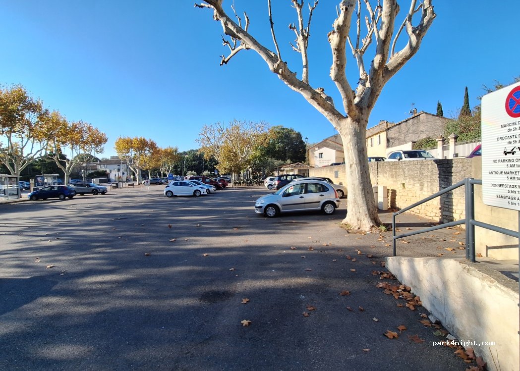 Parking au top ! beaucoup de place, plutôt calme même si la route est proche. Point d’eau à côté du parking ( remplir au bidon pas possible de brancher un tuyau). Village super beau à visité + bus juste en face du parking pour rejoindre le centre d’avignon!