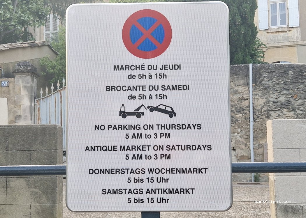 Free parking lot with lots of parking spaces. There is drinking water, rubbish bins and a toilet on the opposite side. Nearby you can see the Fort Saint-André (free for Europeans under 25 by the way) and it takes about 25 minutes to get to downtown Avignon. Attention: Parking is forbidden on Thursdays between 05:00 - 15:00 and on Saturdays between 05:00 - 15:00 due to Antique Market!