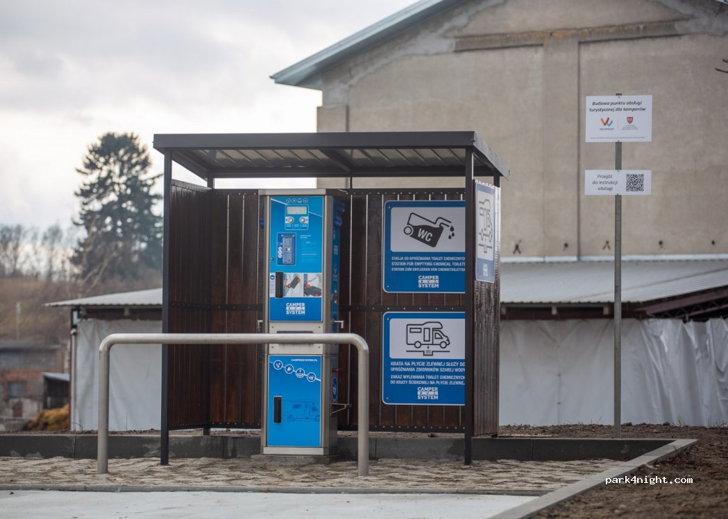 Aire de service Camper System avec accès payant à l'eau et à l'électricité. Paiement en pièces polonaises. L'évacuation des eaux noires et grises est gratuite.