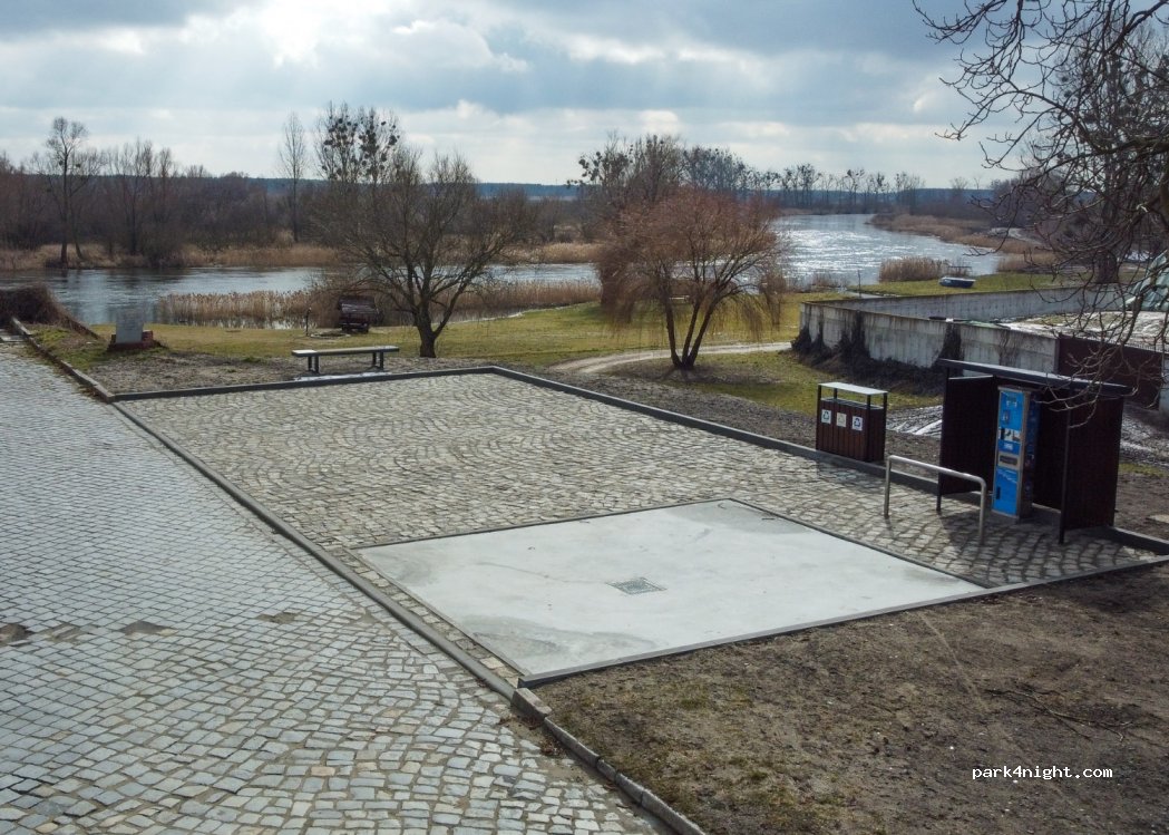 Excellent spot! Parking with river view, water (1PLN/10L), electricity (1PLN/1h), grey water dump, WC chem dump, shower and toilet in nearby building. In the area benches, wooden huts, fireplaces. Small beach at the river bank. A few security cameras around (not at the camp spot, though). We spent Sat night here, so there were some locals partying at the bank, but didn't cause any real trouble.
