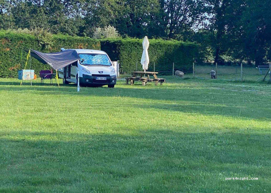 Accueil très sympathique des propriétaires dans un grand pré, possibilité de se raccorder à l’électricité, compris dans la nuitée 10 euros le 7/7/22. Eau dispo également ainsi que tables et bancs ,c’est vraiment chouette de trouver un lieu comme ça . Possibilité de profiter de la piscine avec supplément et possibilité de se restaurer ou boire un verre J’oublie les brebis et une oie. Lieu Parfait