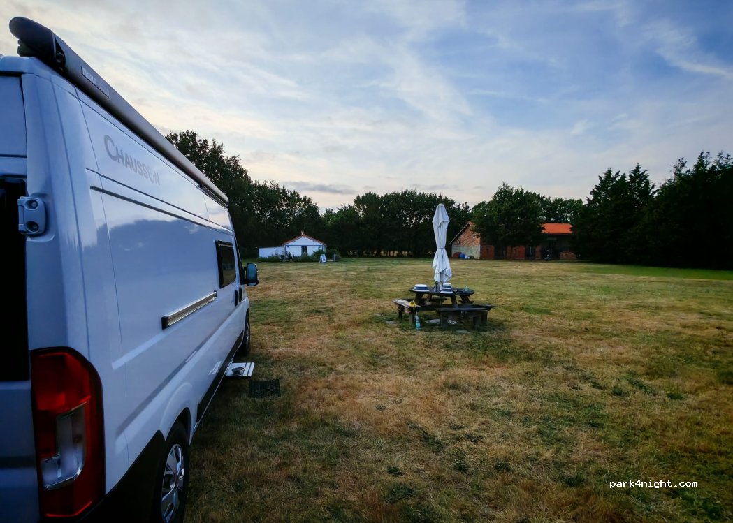 Pour 10 euros voilà une alternative lorsqu’on ne trouve pas de spot nature. Il y a des wc au font du terrain, possibilité d’avoir de l électricité et un accès à l eau (robinet) vous pouvez faire une machine (4€) la propriétaire est très sympa; par contre un peu en promiscuité avec les autres vaneurs et camping caristes