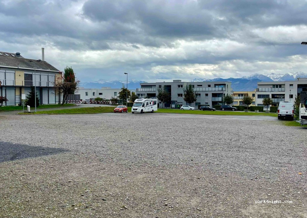Parking lot from the multipurpose hall, you can park for 15 hours, ideal for 1 night. There is a Migros nearby and a glass container on the edge of the parking lot.