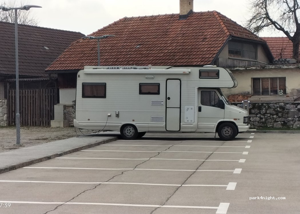 Nous y avons dormi un samedi soir, les cloches sonnent jusqu'à 23h/23h30 et reprennent à 7h50. Des jeunes ont discuté jusqu'à 23h30 près du centre. Une borne de branchement électrique. Globalement une bonne nuit. GRATUIT. (et ça ça vaut de l'or en Slovénie..)
