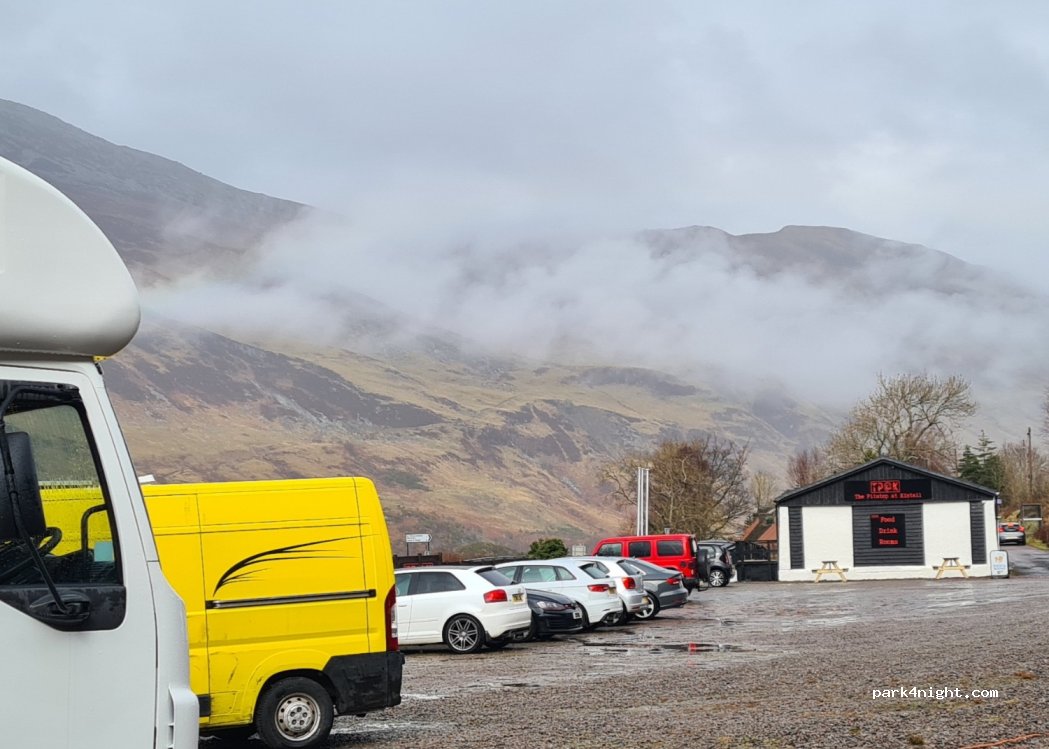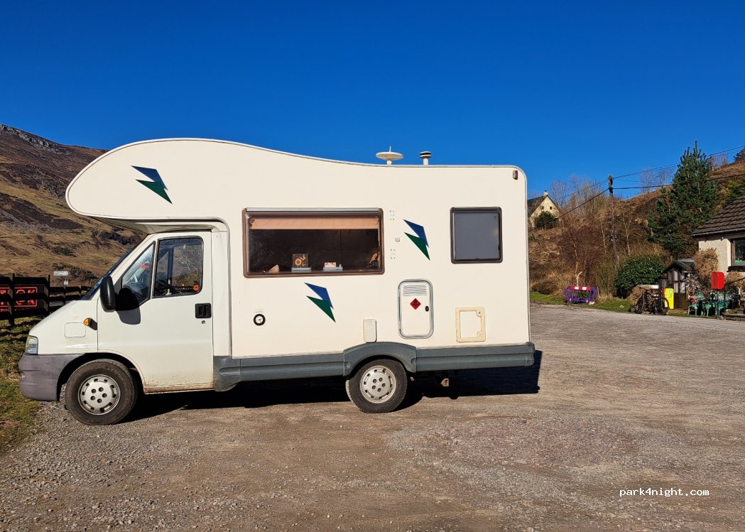 Motorhome Aire at The Pitstop at Kintail. Pay in the cafe from 10am to 7:30pm. Please pay in the cafe to stay overnight.