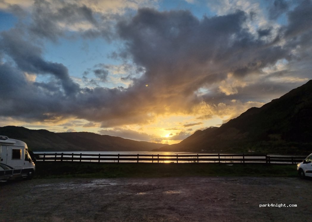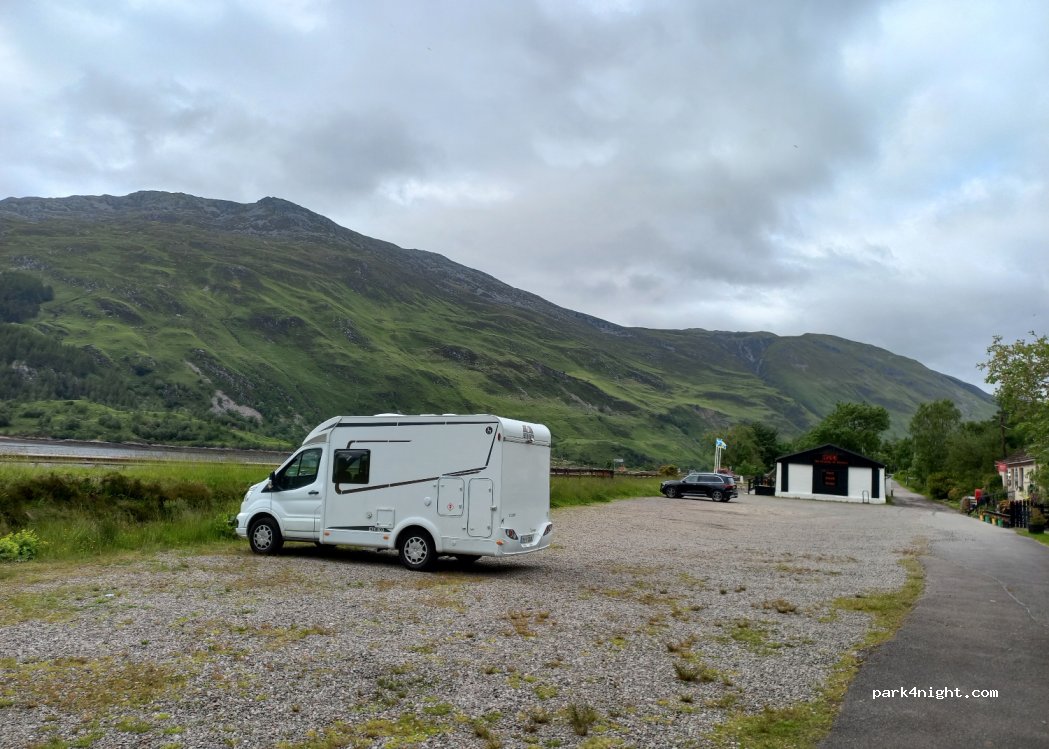 lovely aire to stopover for the night. £5, payable to the lady in the cafe. stunning views of Loch Duich and the mountains. The cafe has just reopened for the season today. it's lovely and warm, with a warm welcome from the owners, nice hot drinks and tasty food, with a gorgeous view. No amenities, but very reasonable for a gorgeous overnight stop.