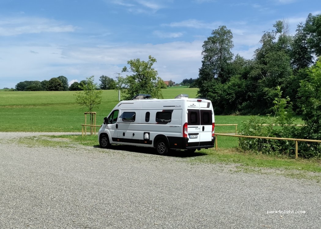 Parkplatz 200 m hinter dem Schwimmbad. Sehr ruhig. Ein griechisches Restaurant befindet sich im 300 m Entfernung. Zufahrt über Leutkircher Str. in Wangen.