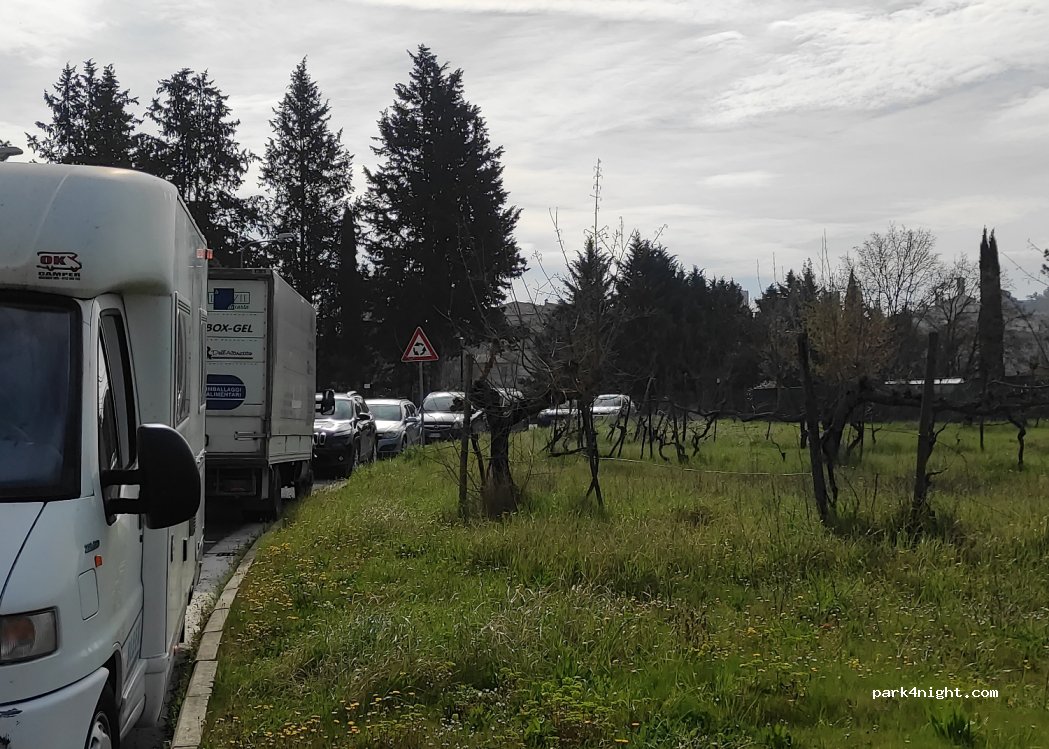 Closed road with free parking spaces, slightly sloping on asphalt. found because the other parking lot was full. little traffic even though it is practically on the road. not far from the center of Asciano
