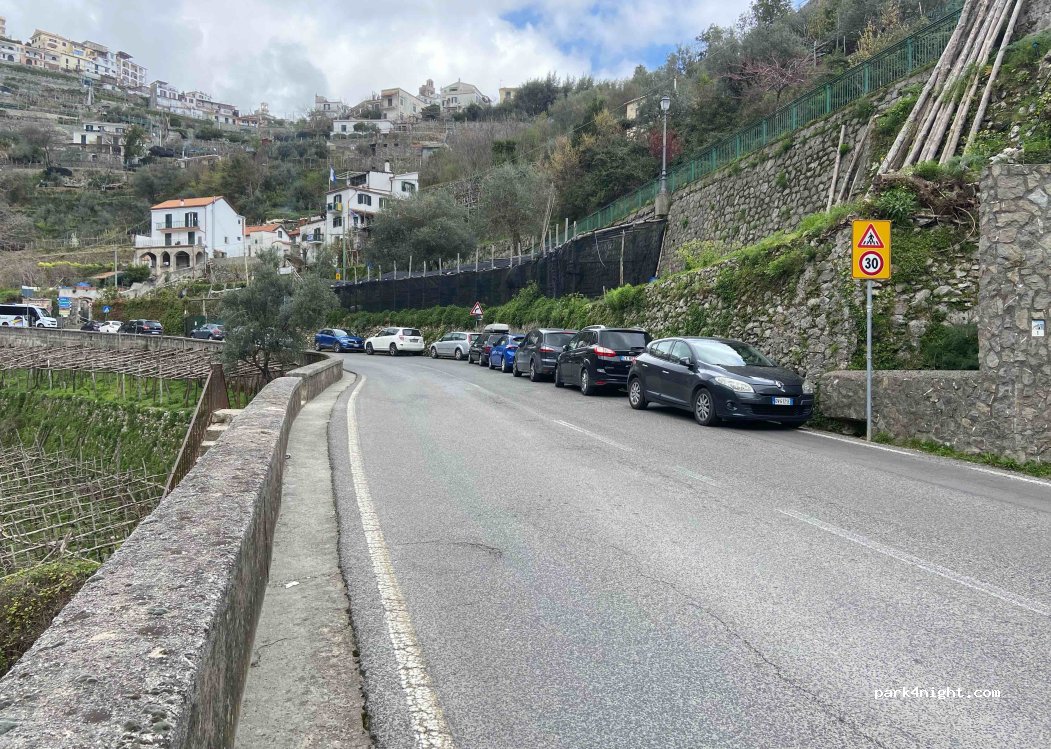 Parking along the road to Ravello. To the city center (Cathedral Square) about 10 minutes on foot. No restrictions. Weird, not flat. Good for visiting Ravello, from there you can also hike to Amalfi.