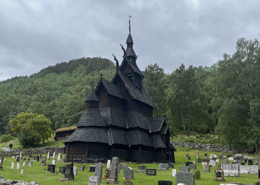 Parking de l'église en bois debout stavkyrkje de Borgund.