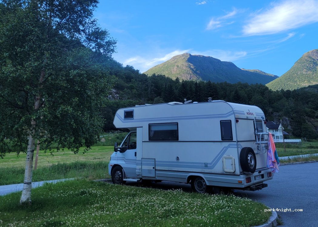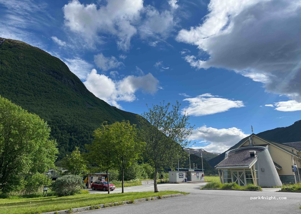 Small parking, ideal for a night. Access to toilets and (chargeable, 40 nok for 5 min) showers around the clock. Wooden benches available. Road in the immediate vicinity, but quiet at night.