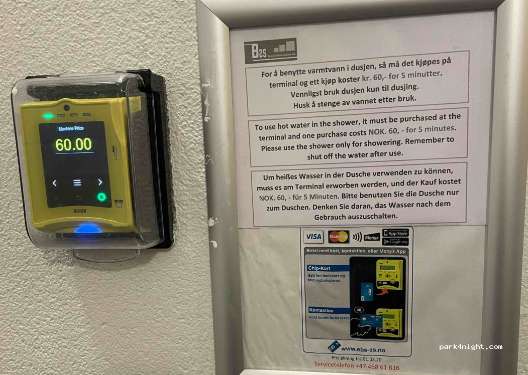 Warme Dusche für 60 NOK (Kartenzahlung) hat wunderbar funktioniert.