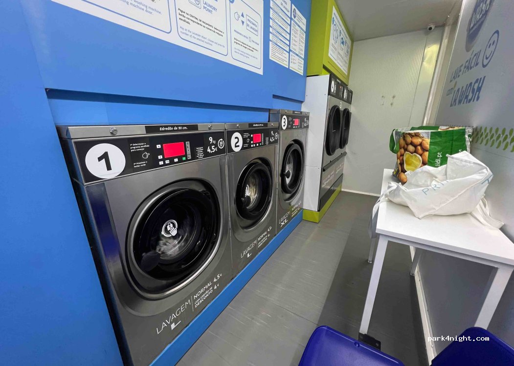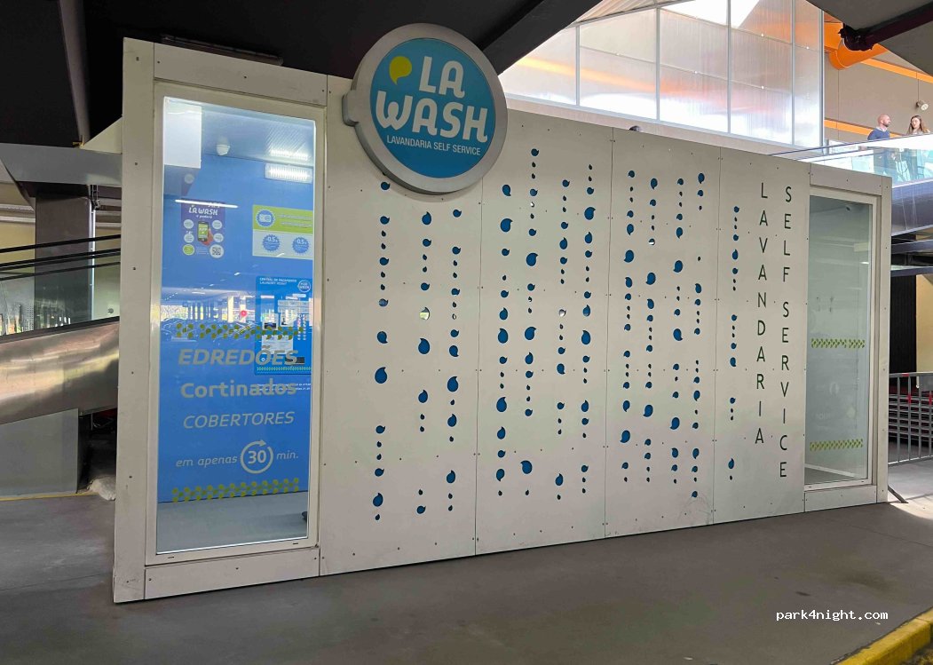 Self serve laundry in the covered parking of Minho Shopping Centre. 2.5m height limit for undercover parking, 2.2m height limit for parking directly above, however parking lot just opposite next to car wash and fuel station with no height limit. Cash only (notes and coins) - or download the app to pay by phone. Discount card available for slight discount. Toilet, WiFi and multiple shopping possibilities in shopping centre above while you wait.