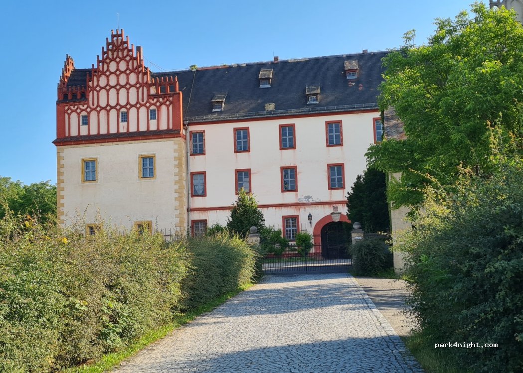 Schlossparkplatz, z.T. schattig, recht eben, super für autarke Camper, direkt an der Mulde mit Paddlereinstieg und somit Bademöglichkeit. Kleiner Ort mit viel Historie. Rad- und Wanderwege.