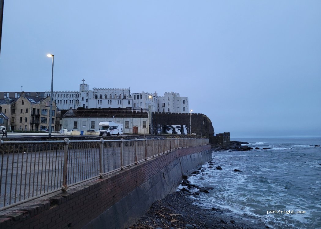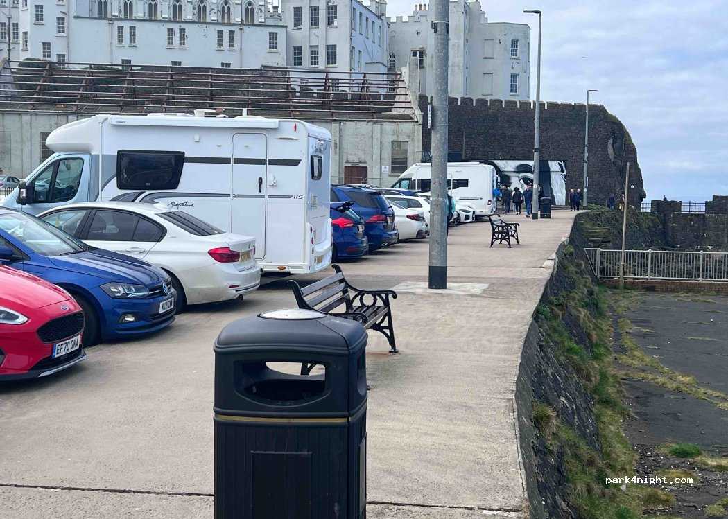 Parking along the crescent over looking the sea by the castle, you can park for free and overnight from 1st Sept until the 31st May with no restriction. Otherwise 2 hours only 9am-5pm. The last 8 bays area a little longer and fit a 6 Meters MH. Lots of lovely local eateries, super market up the promenade. Plenty to do, Beach, playground, toilets, and walking the scenic costal paths.