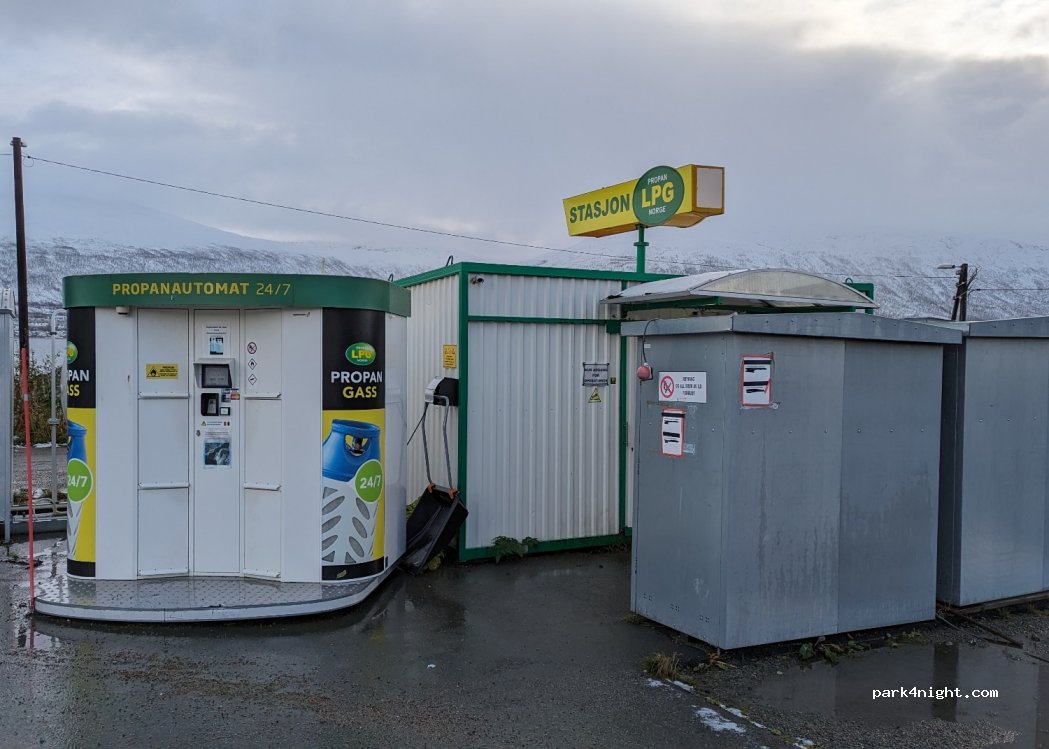 24/7 automatic LPG service station with card for tanks. To fill the gas cylinder, a number must be called and an appointment made. Only LPG filling station in Tromsø. Take into account the 12 NOK to enter Tromsø (valid for 1 hour before paying again to exit) outside rush hour or from 06:30-09:00 15:00-17:00 = 36 NOK.
