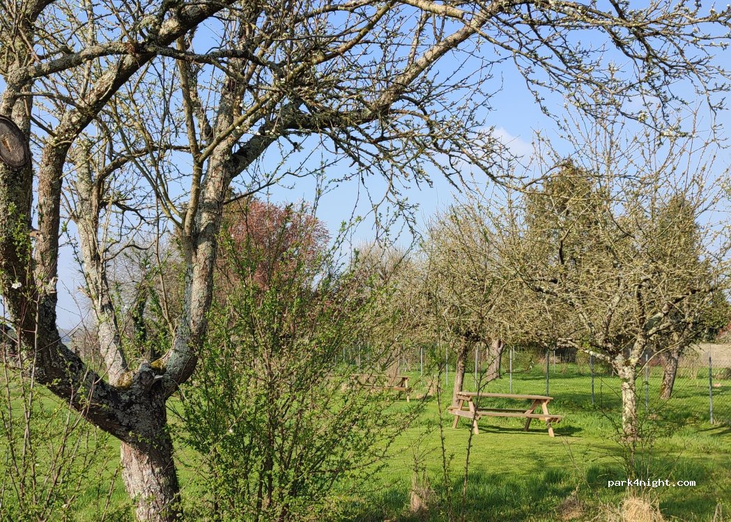 Très bel accueil par les propriétaires. Le lieu est très propre et entretenu. Au calme en retrait de la route, les emplacements sont spacieux, en herbe ou sur gravillons selon la disponibilité. des tables en bois sont à la disposition ainsi qu'une balançoire pour les enfants. le prix est correct, 8€ le stationnement. Un point d'eau est disponible en dehors de la propriété devant la mairie à 50m.