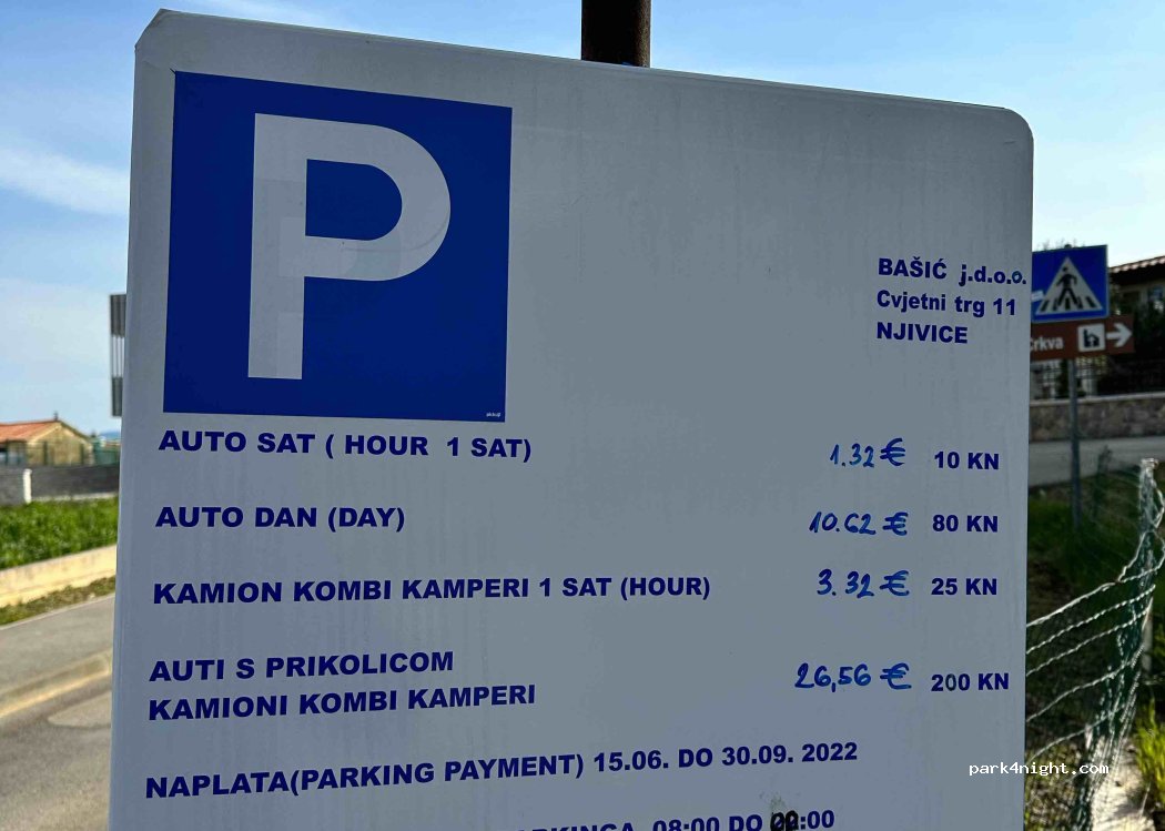 Good off season parking. Off season is free. Between June and September you have to pay (see picture). We stayed there one day and night. Directly access to the beach. You can hear the church bells a few meters away, but that didn’t bothered us. Besides that, it was very very quite. Trash cans nearby.
